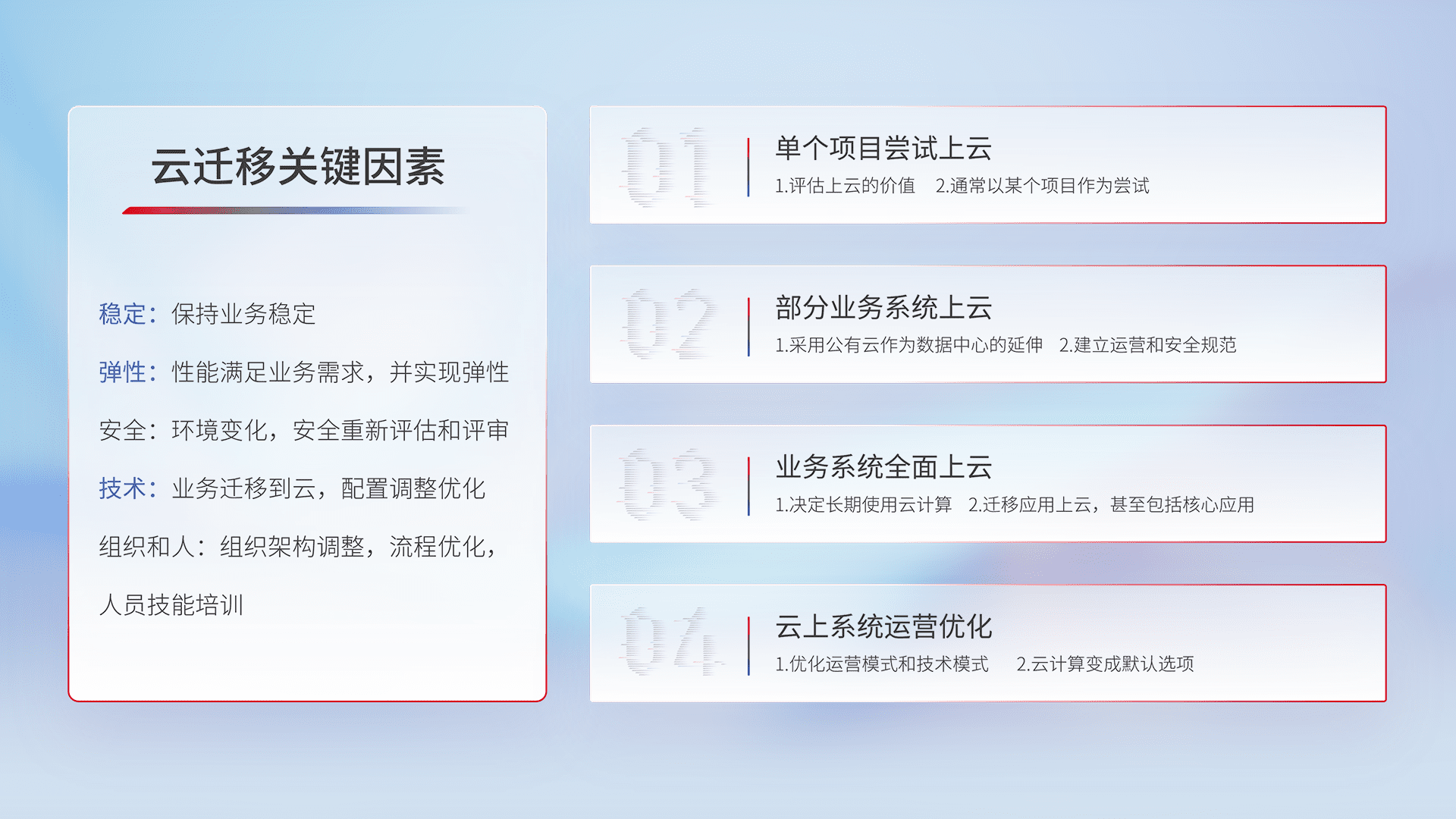 结合实际业务,,,,从规划设计、、、、云平台选型、、、云原生改造、、、、数据迁移、、集成交付,,迁移全过程为客户识别最佳上云路径,,,做好风险识别管理,,设计网络架构、、、身份权限、、、、安全审计合规、、、操作审计、、、日志审计、、、、监控告警策略、、多站点容灾设计等,,对云上基础设施进行整体规划,,提升IT治理水平,,,以满足弹性、、、高可用、、高性能的需求。。。