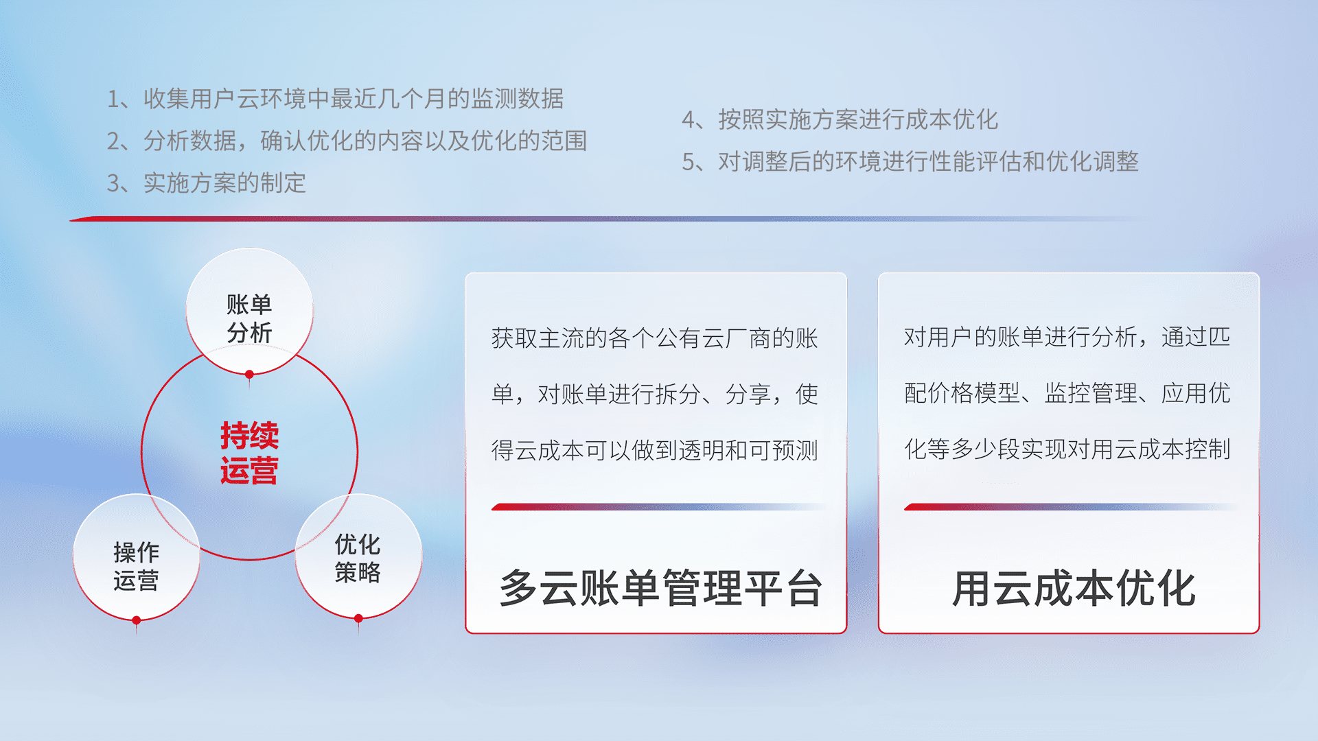通过多云纳管,,,,以统一的资源数据模型把客户的云资源进行抽象和封装,,,进而实现对多云资源的统一操作,,,,保障云资源管理的可靠性、、、稳定性与可用性。。。量身定制化运维内容,,配置、、、开发运维、、、、补丁管理、、备份、、、监控、、、、认证和访问管理、、、、审计和日常巡检等,,,保障在用云过程中的可靠度,,稳定度以及高可用率。。